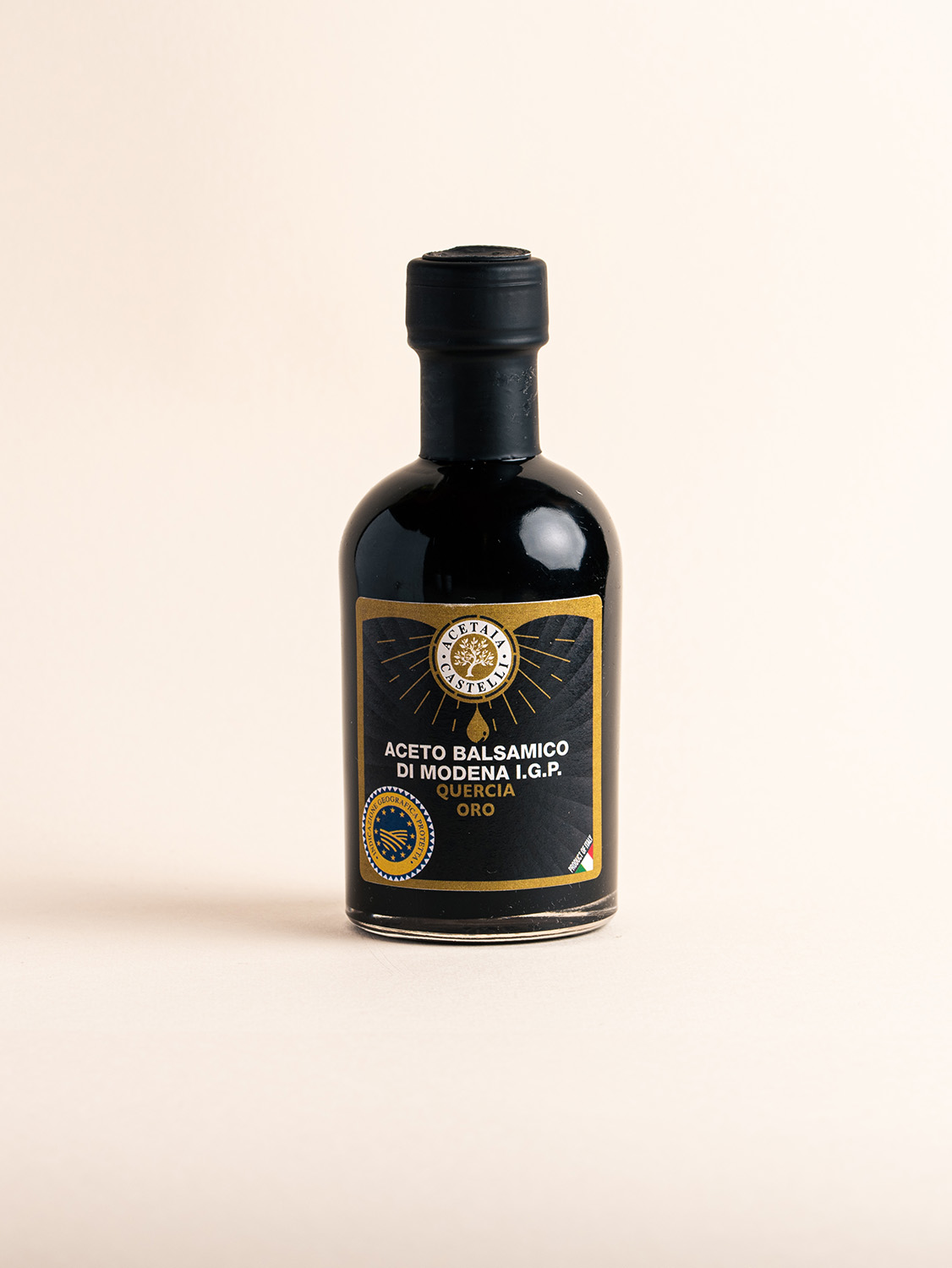 L’Aceto Balsamico di Modena IGP “Quercia Oro Concentrato” di Acetaia Castelli rappresenta una delle espressioni più ricche e strutturate della tradizione emiliana dell’aceto balsamico. Prodotto nel territorio dell’Emilia-Romagna secondo il disciplinare dell’Indicazione Geografica Protetta, nasce dalla miscela di mosto d’uva cotto e aceto di vino, ingredienti che conferiscono il caratteristico equilibrio tra dolcezza e acidità.