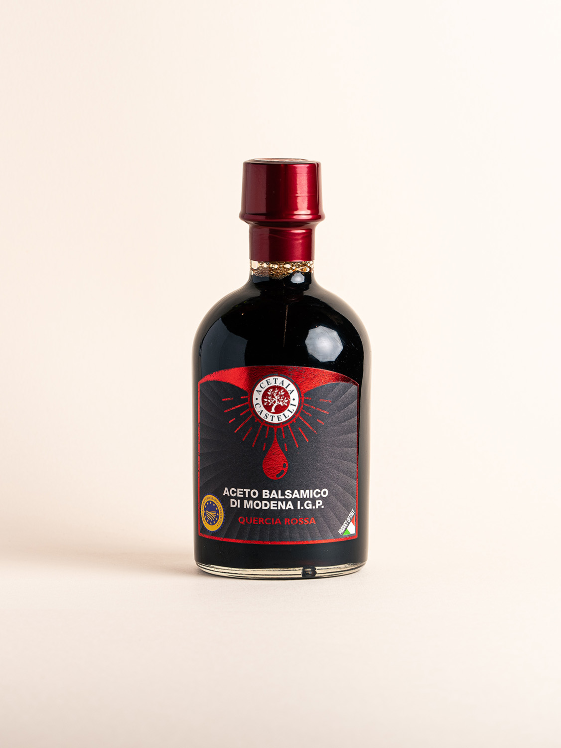 L’Aceto Balsamico di Modena IGP “Quercia Rossa” di Acetaia Castelli nasce nel territorio dell’Emilia-Romagna, area storicamente legata alla produzione del vero aceto balsamico di Modena. Realizzato secondo il disciplinare dell’Indicazione Geografica Protetta, questo condimento è ottenuto dalla miscela di mosto d’uva cotto e aceto di vino, ingredienti che conferiscono il tipico equilibrio tra dolcezza e acidità.