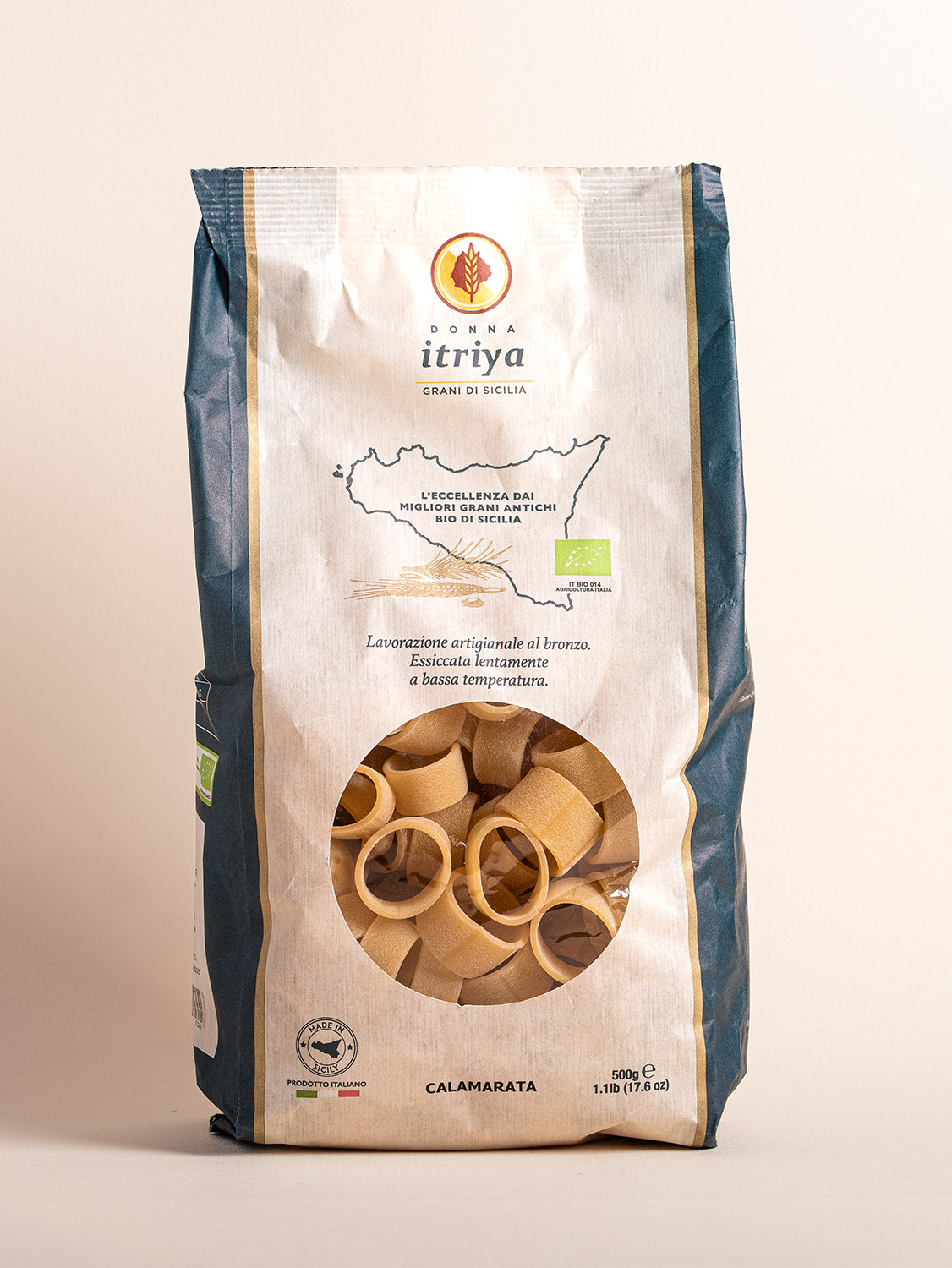 Calamarata artigianale 500 g – Donna Itriya: grano antico biologico, essiccazione lenta, formato a anello ideale per sughi e piatti gourmet.