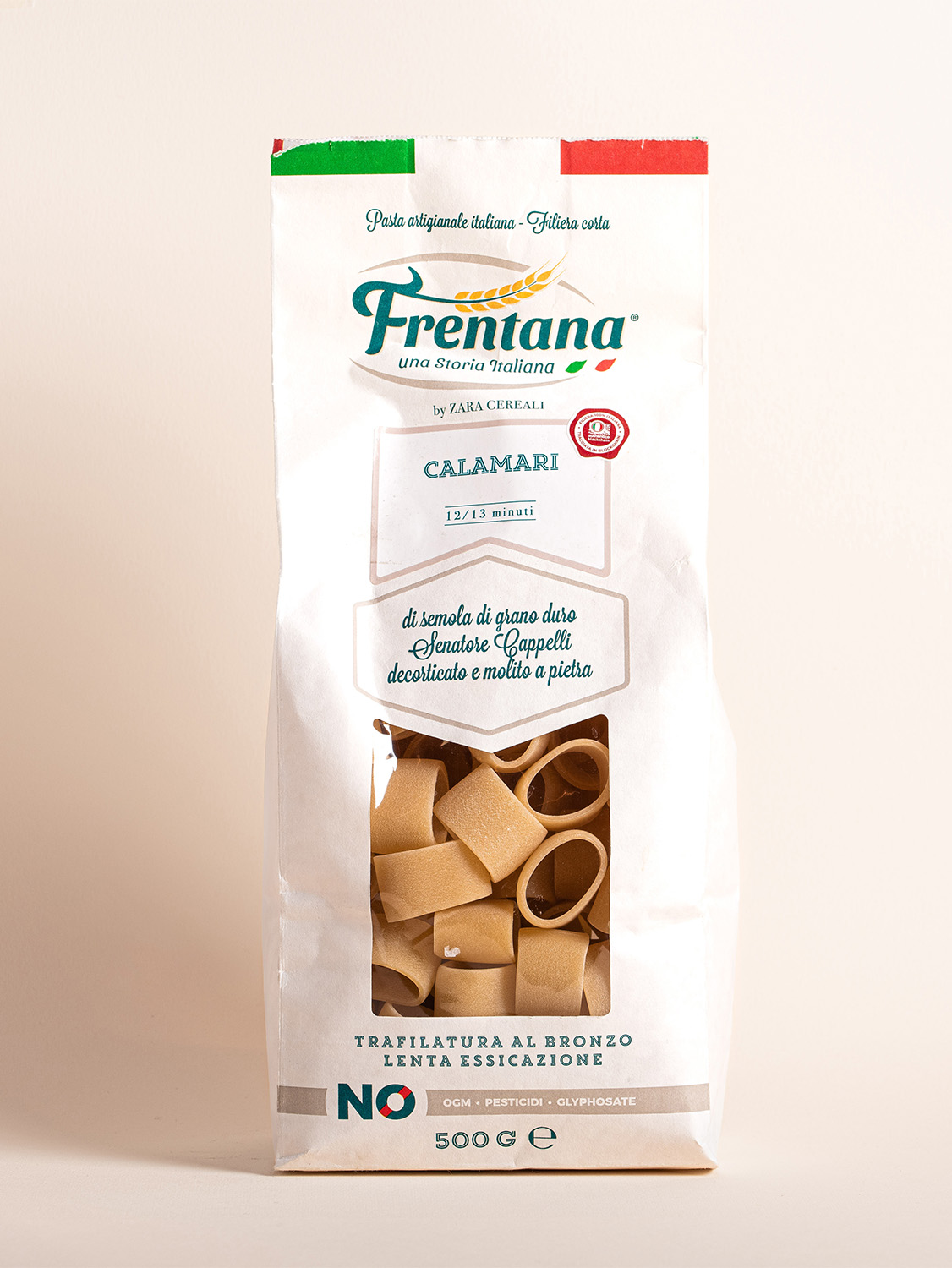 I Calamari di Grano Duro Senatore Cappelli di Pasta Frentana sono una pasta artigianale realizzata con il pregiato grano duro antico “Senatore Cappelli”. La semola, naturalmente ricca di aromi e nutrienti, viene lavorata con trafilatura al bronzo e sottoposta a lenta essiccazione, garantendo una consistenza corposa e una superficie ruvida perfetta per trattenere ogni tipo di condimento.