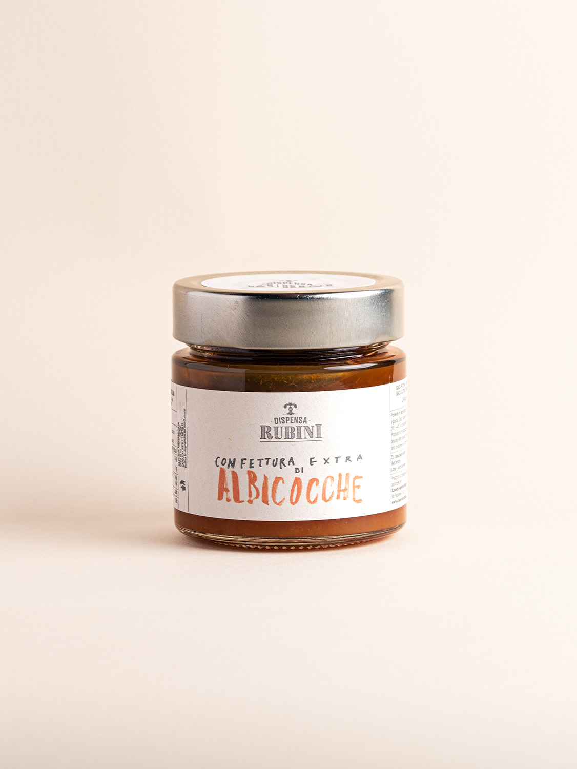 Confettura extra artigianale di albicocche Dispensa Rubini. Preparata con frutta fresca e zucchero, senza conservanti, dal gusto autentico e naturale.