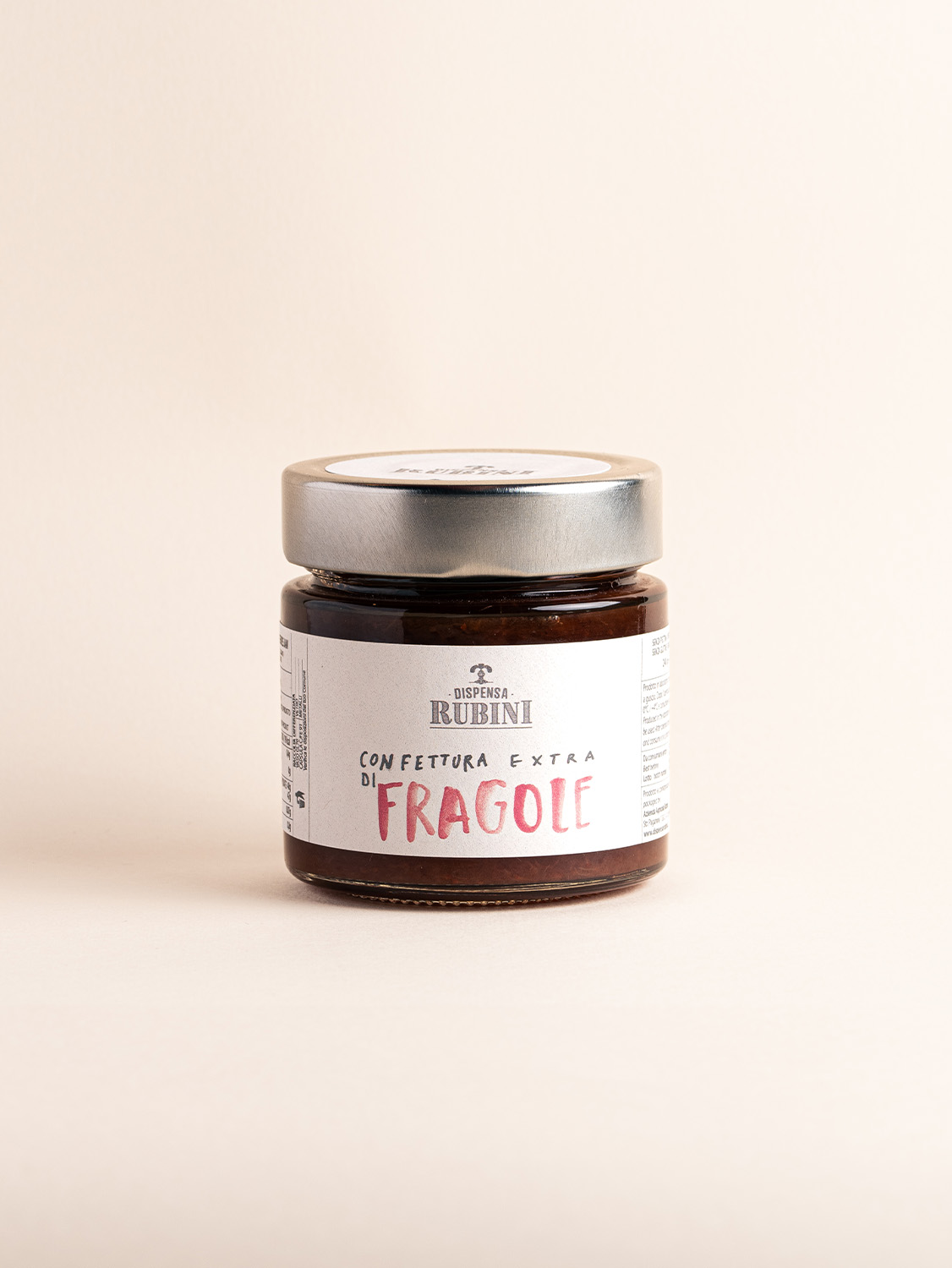 Confettura extra artigianale di fragole Dispensa Rubini. Preparata con frutta fresca e zucchero, senza conservanti, dal gusto autentico e naturale.