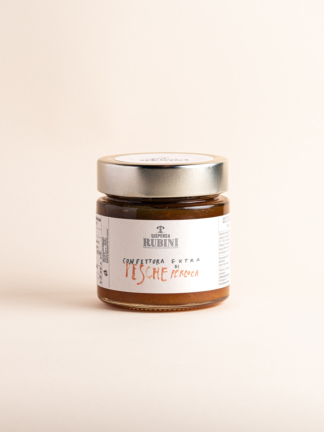 Confettura extra artigianale di pesche percoca Dispensa Rubini. Realizzata con frutta fresca e zucchero, senza conservanti, dal gusto pieno e naturale.
