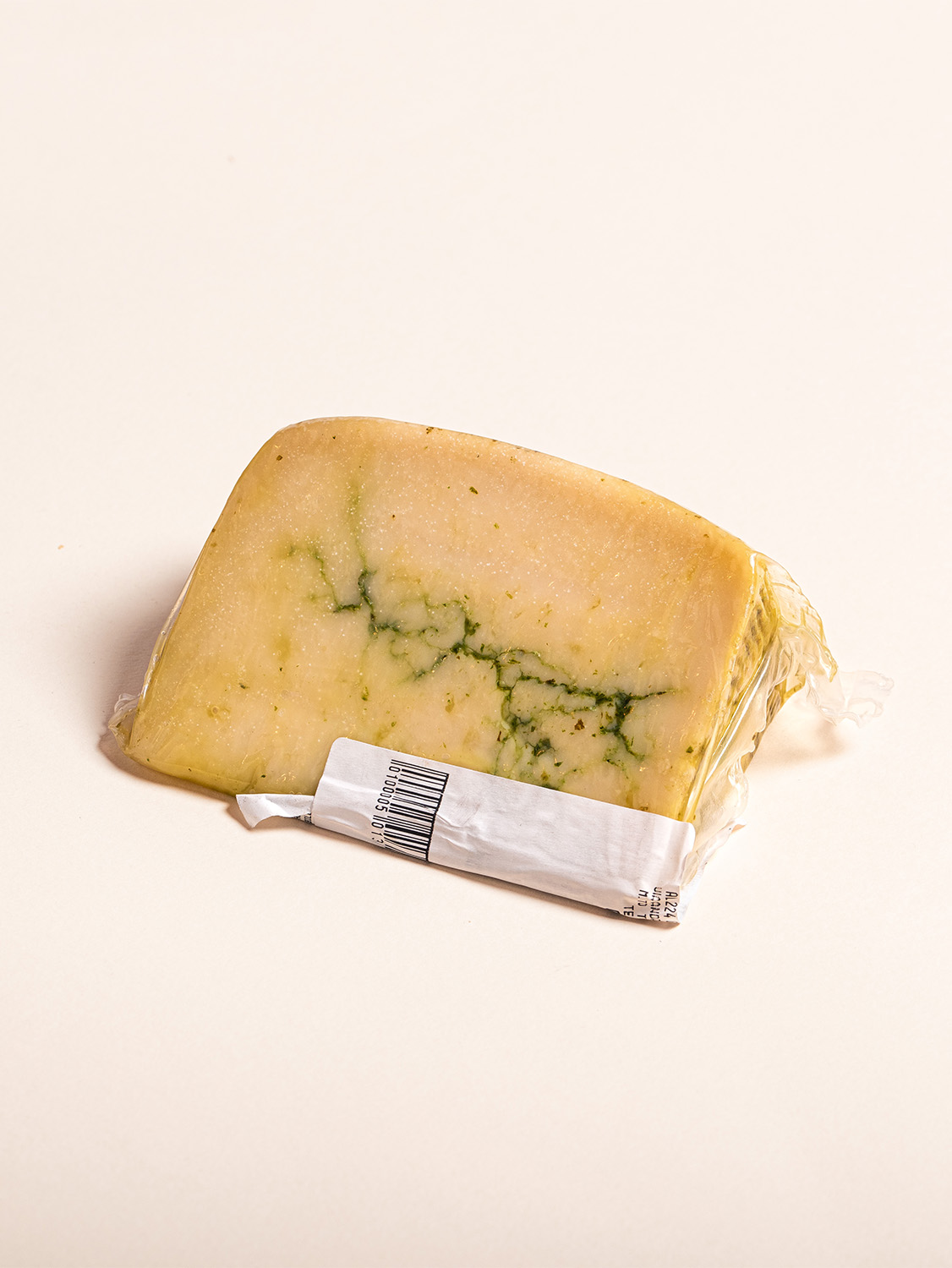 Formaggio Piccolo Canestrato al Pesto, dal sapore intenso e aromatico. Perfetto a fette, in antipasti o per arricchire piatti gourmet.