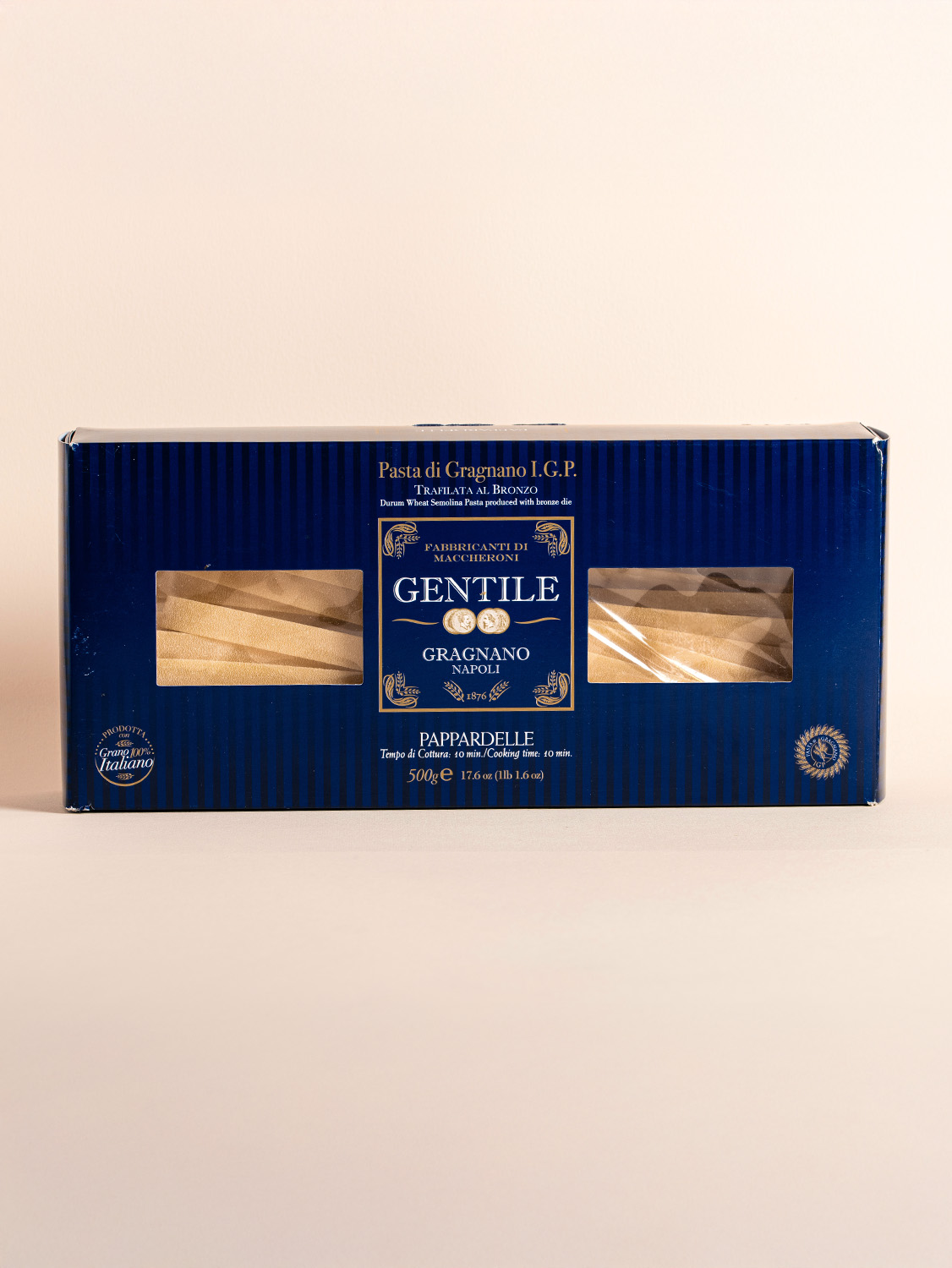 Pappardelle Gentile di Gragnano IGP, 500g. Pasta artigianale larga e porosa, trafilata al bronzo, ideale con ragù e sughi ricchi.