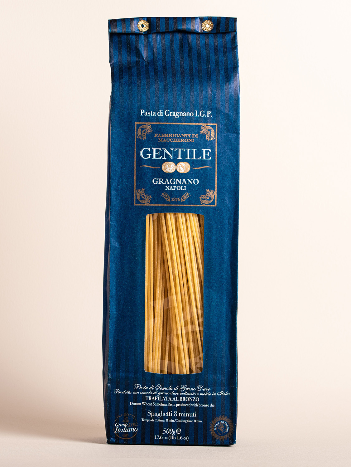 Spaghetti 8 Minuti Gentile di Gragnano IGP, 500g. Pasta lunga trafilata al bronzo ed essiccata lentamente, pronta in 8 minuti, ideale per piatti saporiti e veloci.