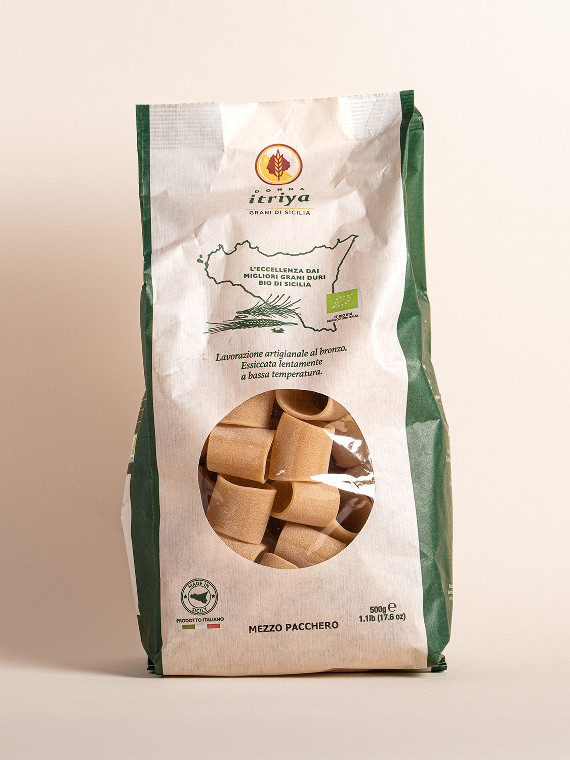 Mezzi paccheri artigianali 500 g – Donna Itriya: grano duro biologico, essiccazione lenta, superficie ruvida, perfetti per ripieni e sughi corposi.