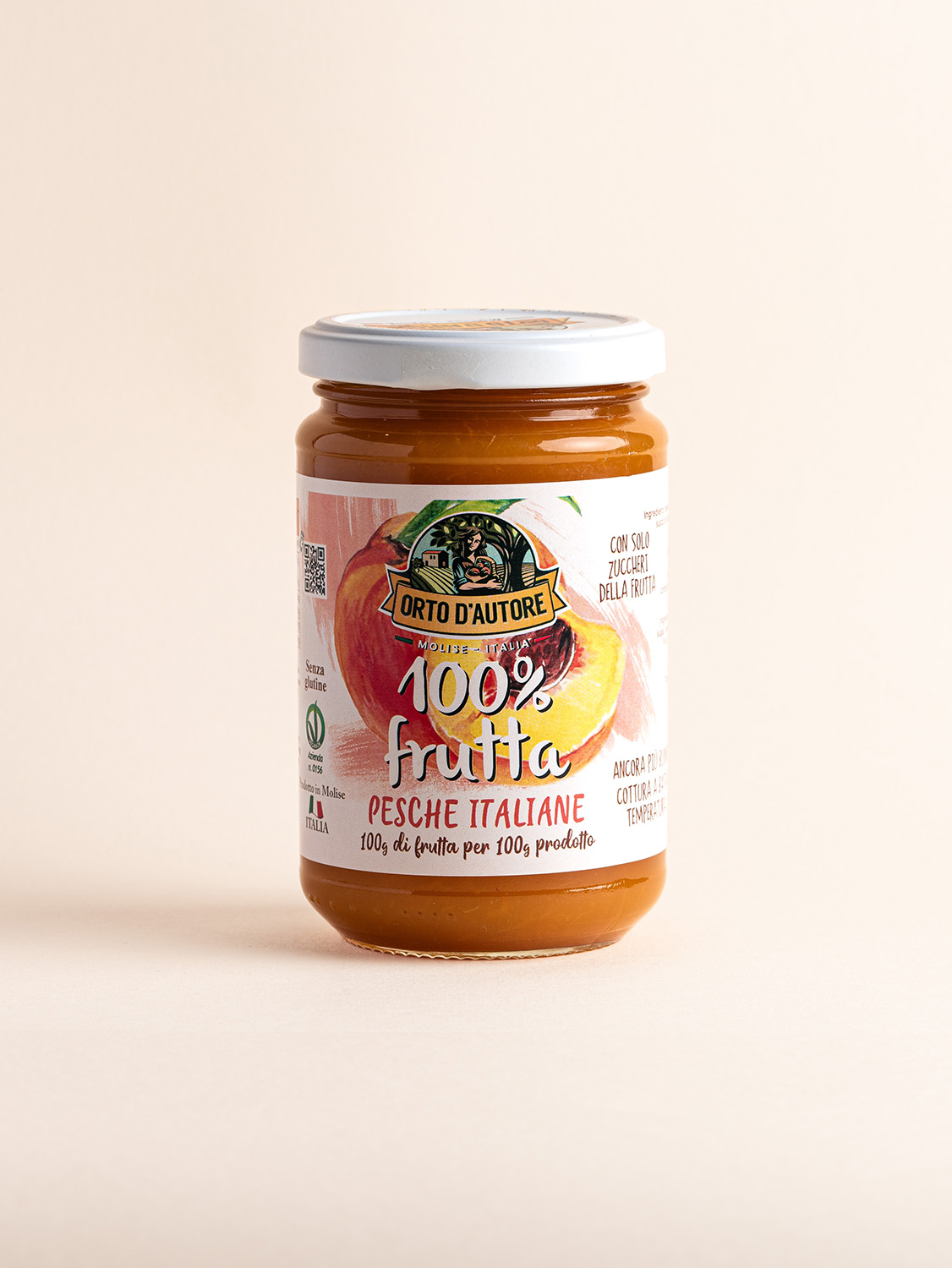 Preparato con 100% pesche italiane e zucchero d’uva. Senza glutine, senza conservanti, adatto a vegani.