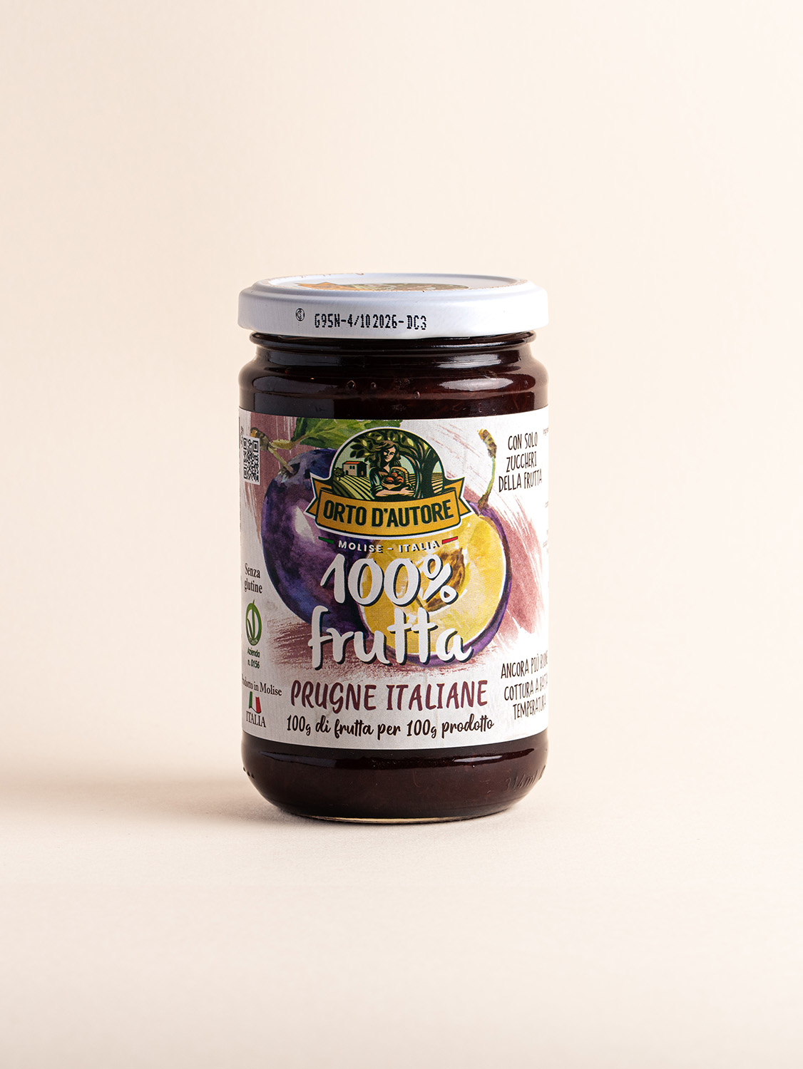 Preparato con 100% prugne italiane e zucchero d’uva. Senza glutine, senza conservanti, adatto a vegani.