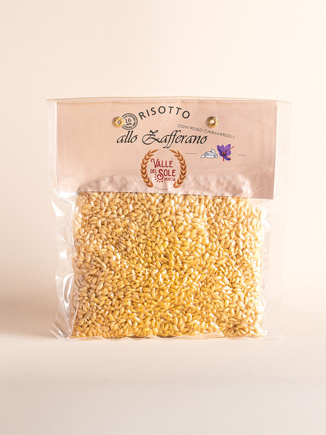 Risotto pronto 200 g – Valle del Sole Norcia: riso Carnaroli italiano con zafferano, facile da preparare, cremoso e aromatico.