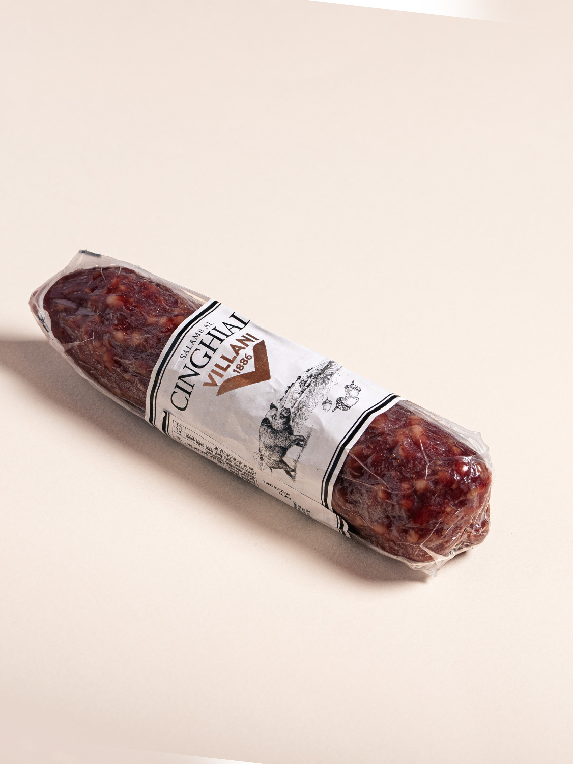 Il Salame al Cinghiale Villani è un salume artigianale italiano realizzato con carne selezionata di cinghiale e carne suina locale, arricchito da spezie naturali che ne esaltano il gusto intenso e caratteristico. La stagionatura tradizionale conferisce al salame una pasta compatta e saporita, dal sapore deciso e aromatico, ideale per taglieri, antipasti o piatti gourmet.