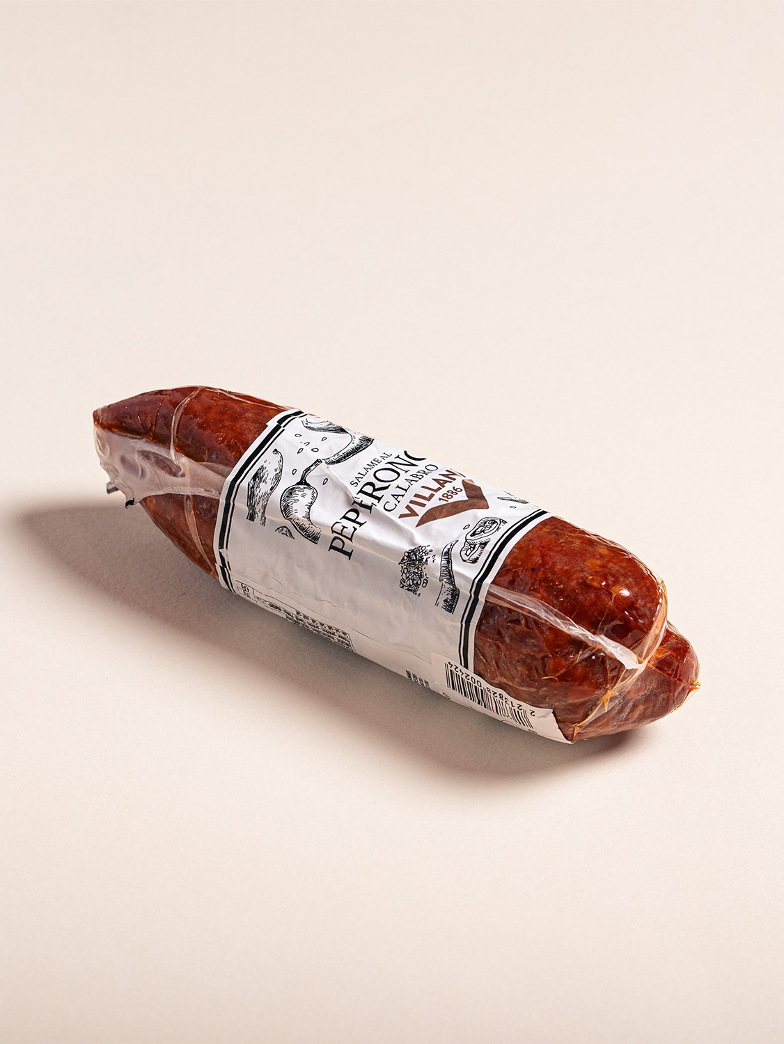 Salame al Peperoncino Calabro Villani 240 g. Salume artigianale dal gusto piccante e aromatico, perfetto per taglieri e antipasti dal carattere deciso.