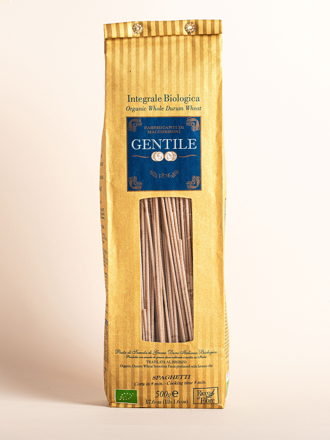 Gli Spaghetti Integrali Biologici del Pastificio Gentile sono una pasta artigianale di Gragnano, ottenuta da semola integrale di grano duro biologico e acqua pura di sorgente. La lavorazione tradizionale, la trafilatura al bronzo e la lenta essiccazione a bassa temperatura assicurano una consistenza corposa e una porosità ideale per trattenere i condimenti.
