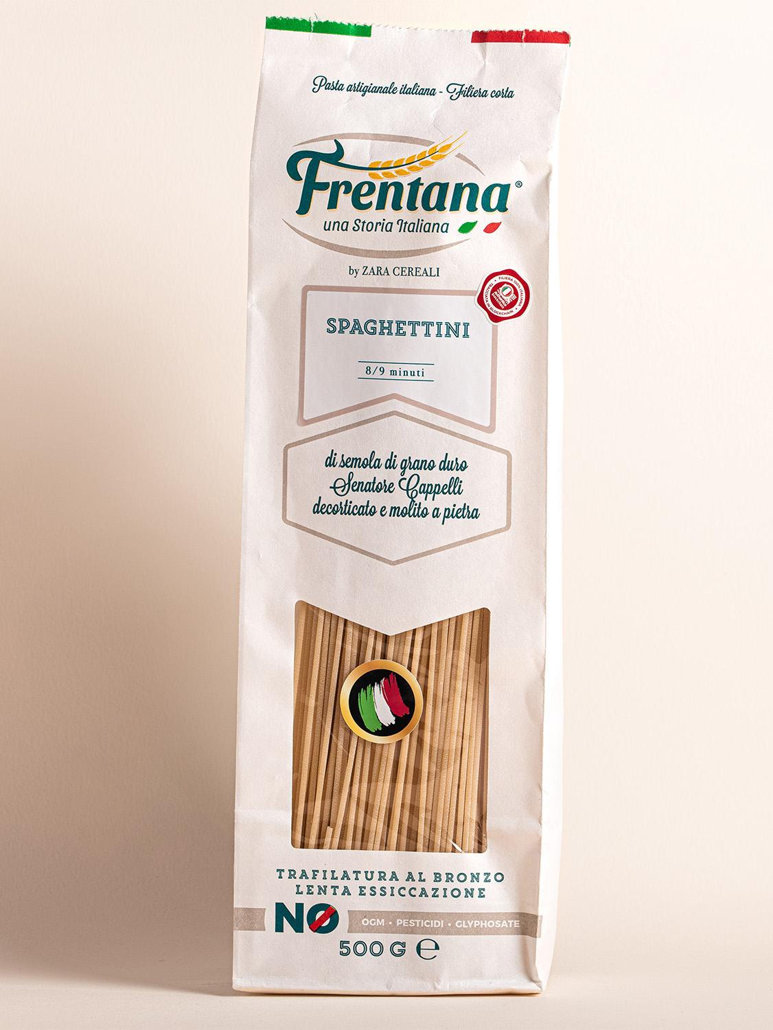 Gli Spaghettini di Grano Duro Senatore Cappelli di Pasta Frentana sono una pasta artigianale realizzata con semola del grano antico italiano “Senatore Cappelli”, noto per il suo aroma intenso e le proprietà nutrizionali. La pasta viene lavorata con trafilatura al bronzo e sottoposta a lenta essiccazione, un processo tradizionale che preserva le caratteristiche organolettiche del grano e conferisce alla superficie una leggera rugosità, ideale per trattenere i condimenti.