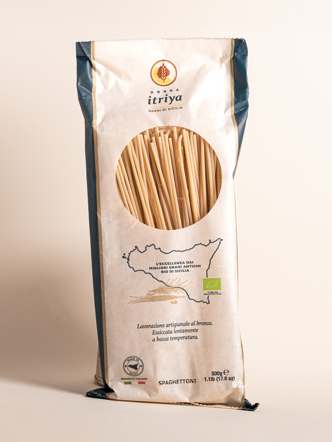 Spaghettoni artigianali 500 g – Donna Itriya: grano antico biologico, essiccazione lenta, superficie ruvida, perfetti con sughi delicati o ricchi.