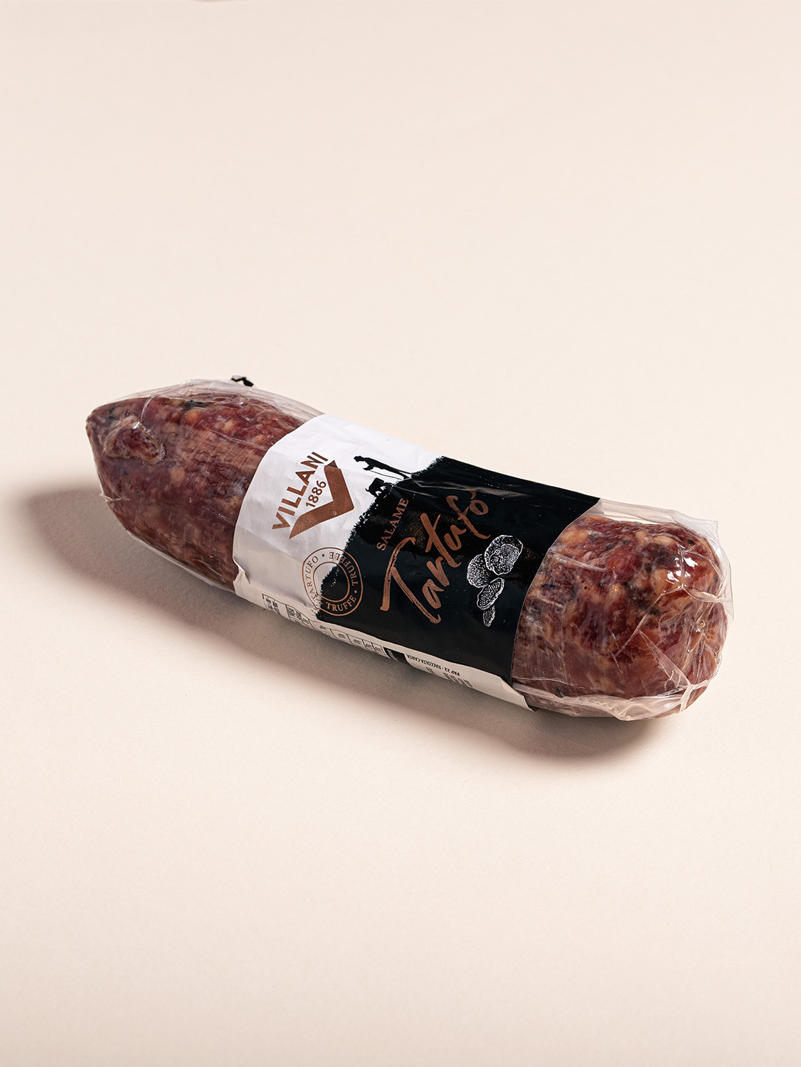 Salame artigianale Villani al tartufo italiano, dal gusto raffinato e aromatico. Perfetto a fette sottili in antipasti, taglieri o piatti gourmet.
